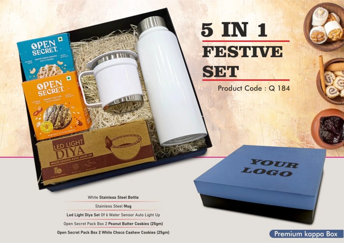 Festive Gift Set | 750ml SS Bottle, Mug with Handle, LED Diya & Cookies