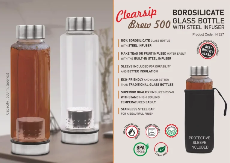 ClearSip Brew 500 – Borosilicate Glass Bottle with Steel Infuser & Cap | 500ml