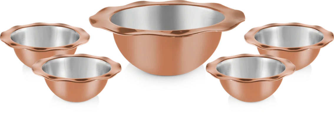 The Belly Dessert Bowl 5 Pcs Set in Stainless Steel Copper Finish from AdiGiftSolution is designed to add a little grace and tradition to any dining or gifting collection. With a fine copper coating adorning this set, it is truly a tasteful blend of durability and luxury appeal, making it apt for personal use or corporate gifting.