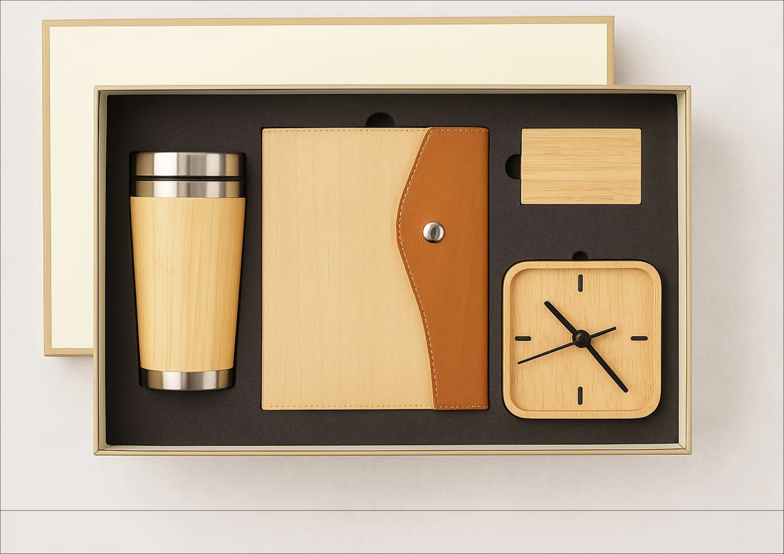 This luxury corporate gift set with diary, tumbler, wooden clock, and card holder is ideal for employee onboarding, corporate events, festive gifting, and client giveaways. Crafted with a natural wooden finish, the set reflects a perfect blend of sophistication and environmental responsibility.