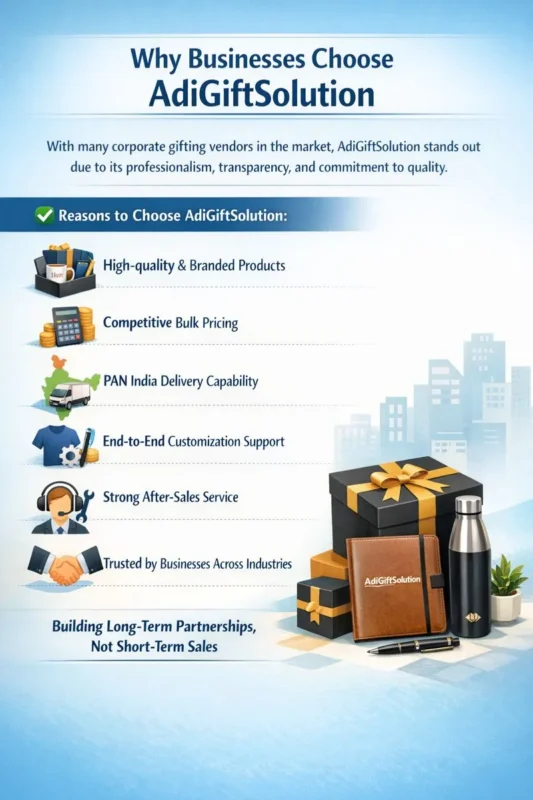✅ Reasons to Choose AdiGiftSolution: The company provides products which meet high standards and carry recognized brand names, The company offers its customers bulk purchasing options at prices which compete with market rates, The company offers delivery services which extend throughout all regions of India, The company provides complete support for customers who need to customize their products according to their specific requirements, The company delivers excellent support to customers who need assistance after their purchase, The company has established itself as a reliable partner for companies operating in various fields